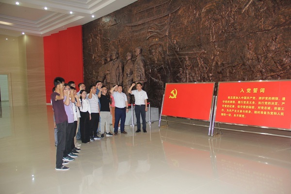 藕塘為抗日戰(zhàn)爭時期津浦路西革命根據(jù)地中心,素有“小莫斯科”之譽稱,是我省首批愛國主義教育基地。在莊嚴(yán)肅穆的烈士陵園,全體人員首先在講解員的帶領(lǐng)下依次參觀了藕塘紀(jì)念館的各個展區(qū),觀看珍貴的文物、文獻、照片等資料,回顧黨的光輝歷程,追尋英雄足跡,緬懷先烈事跡,再次被劉少奇、葉挺、羅炳輝等老一輩無產(chǎn)階級革命家的壯烈事跡所感動。隨后來到紀(jì)念館大廳前,全體黨員面對鮮紅的黨旗,重溫入黨誓詞,進一步牢固“不忘初心、牢記使命”的政治信念。